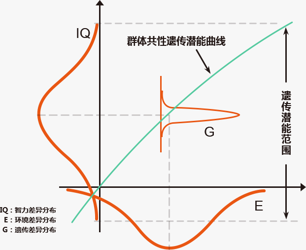 遗传分布、环境分布、遗传潜能与智力分布的关系图